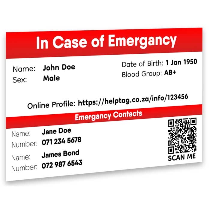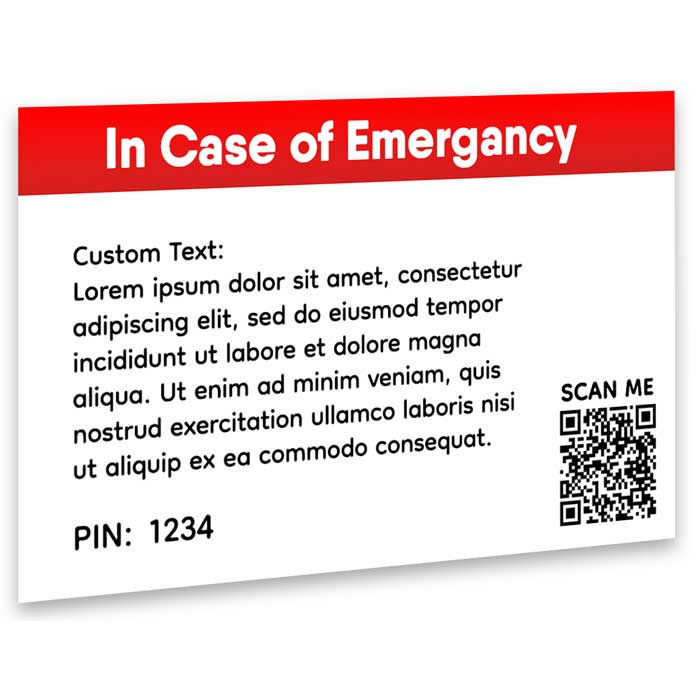 The front of the I.C.E. card is customized to your personal information and emergency contacts. By using the QR Code or the unique link displayed on the front of the card emergency personnel can quickly access your person and medical information. Your information is protected by a PIN. The PIN can only be revealed by scratching off the layer which hides it. On the back of the card, you can have custom text which can be used to describe symptoms, instructions or anything else you would like to put on it.