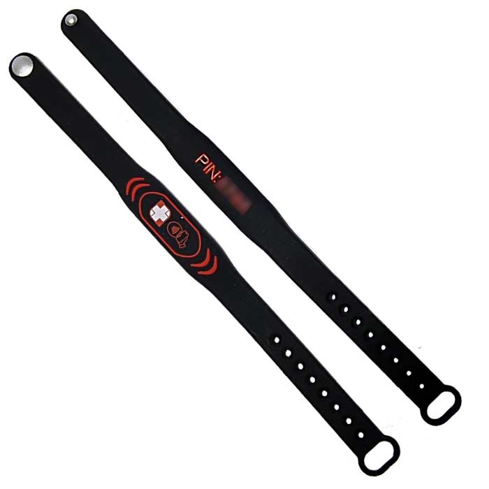 Silicone or 'rubber' wristbands are made of soft and comfortable plastic, which is flexible and water-resistant. These wristbands are suitable for repeated use both inside and outside of the water. The adult wrist band is 240mm in length with an adjustable size from 140mm - 195mm. The wrist band comes with an anti-loss loop to prevent accidental detachment of the strap. Once you tap the wristband, the PIN is securely located on the inside of the strap.